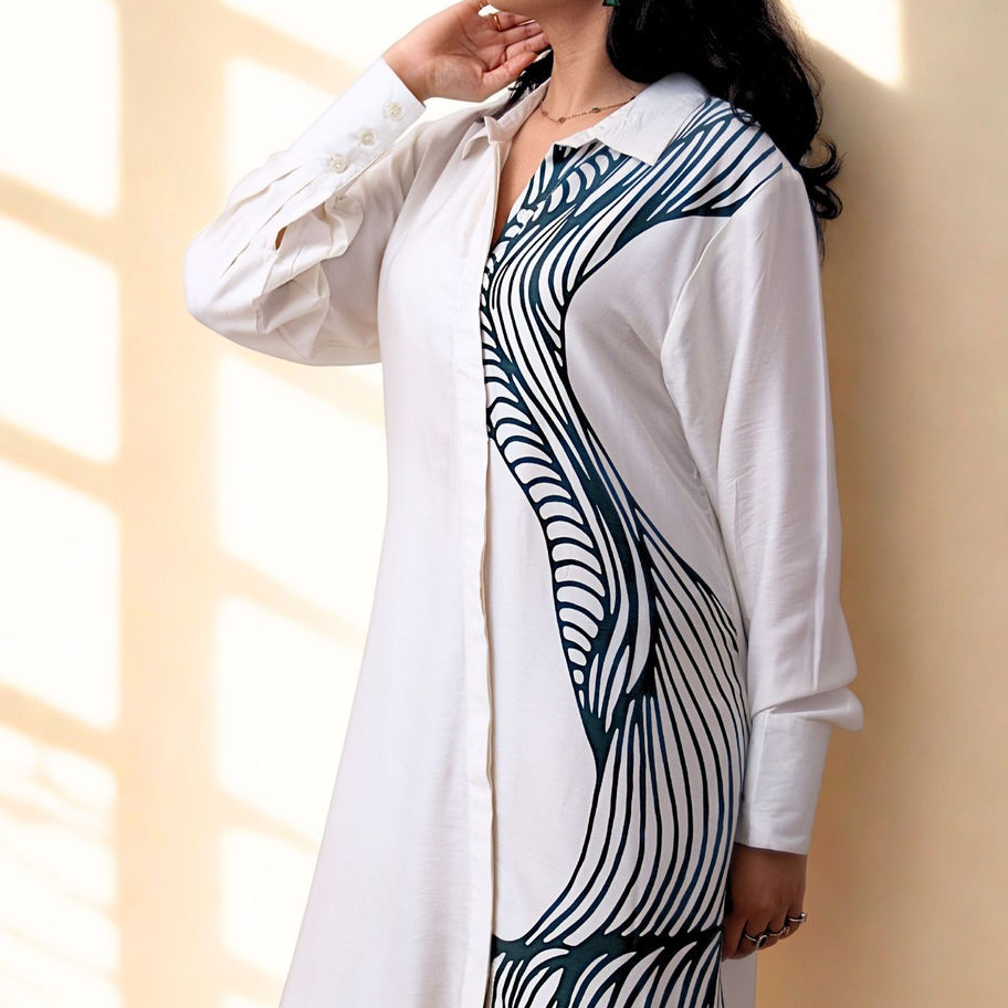 Introducing Kasō, a natural modal satin dress with wabi sabi inspired Spine prints. Kasō is designed to make a statement while ensuring comfort and ease in movement. Full sleeves shirt dress with conceal plackets for a formal, stylish and clean look. Easily transition from day to night this can worn as a formal or party dress or even as a jacket for a relaxed and casual style. Whether you're heading to the office or a night our Kasō is a must-have piece for any fashion-forward individual. Are you ready to wear the art.